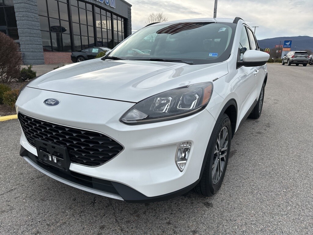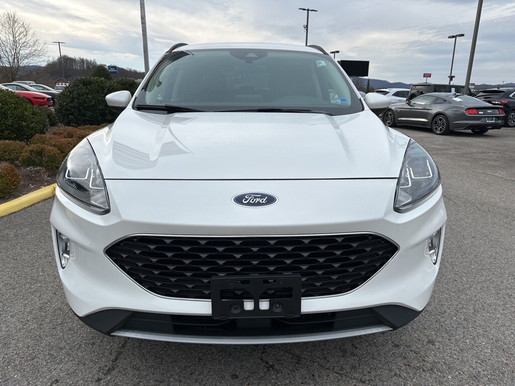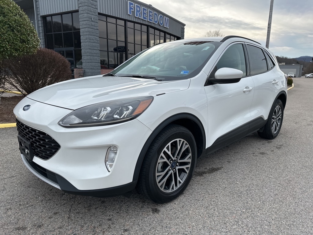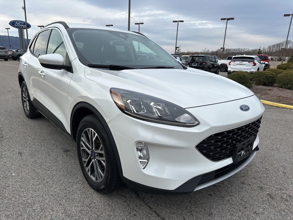 This 2020 White Ford Escape SEL AWD is well equipped and includes these features and benefits: Equipment Group 301A, Ford Co-Pilot360 Assist (Adaptive Cruise Control w/Stop-and-Go and Voice-Activated Touchscreen Navigation System), AWD, 18" Machined-Face Aluminum Wheels, 3.81 axle ratio, 4-Wheel Disc Brakes, 6 Speakers, ABS brakes, Air Conditioning, Alloy wheels, AM/FM radio: SiriusXM, AM/FM Stereo, Auto High-beam Headlights, Automatic temperature control, Brake assist, Bumpers: body-color, Compass, Delay-off headlights, Driver door bin, Driver vanity mirror, Dual front impact airbags, Dual front side impact airbags, Electronic Stability Control, Emergency communication system: SYNC 3 911 Assist, Exterior Parking Camera Rear, FordPass Connect, Four wheel independent suspension, Front anti-roll bar, Front Bucket Seats, Front Center Armrest, Front fog lights, Front reading lights, Fully automatic headlights, Heated ActiveX Front Sport Contour Bucket Seats, Heated door mirrors, Heated front seats, Heated steering wheel, Illuminated entry, Knee airbag, Leather steering wheel, Low tire pressure warning, Memory seat, Occupant sensing airbag, Outside temperature display, Overhead airbag, Overhead console, Panic alarm, Passenger door bin, Passenger vanity mirror, Power door mirrors, Power driver seat, Power Liftgate, Power steering, Power windows, Radio data system, Rear anti-roll bar, Rear reading lights, Rear seat center armrest, Rear window defroster, Rear window wiper, Remote keyless entry, Speed control, Speed-sensing steering, Speed-Sensitive Wipers, Split folding rear seat, Spoiler, Steering wheel mounted audio controls, SYNC 3 Communications & Entertainment System, Tachometer, Telescoping steering wheel, Tilt steering wheel, Traction control, Trip computer, and Variably intermittent wipers.
