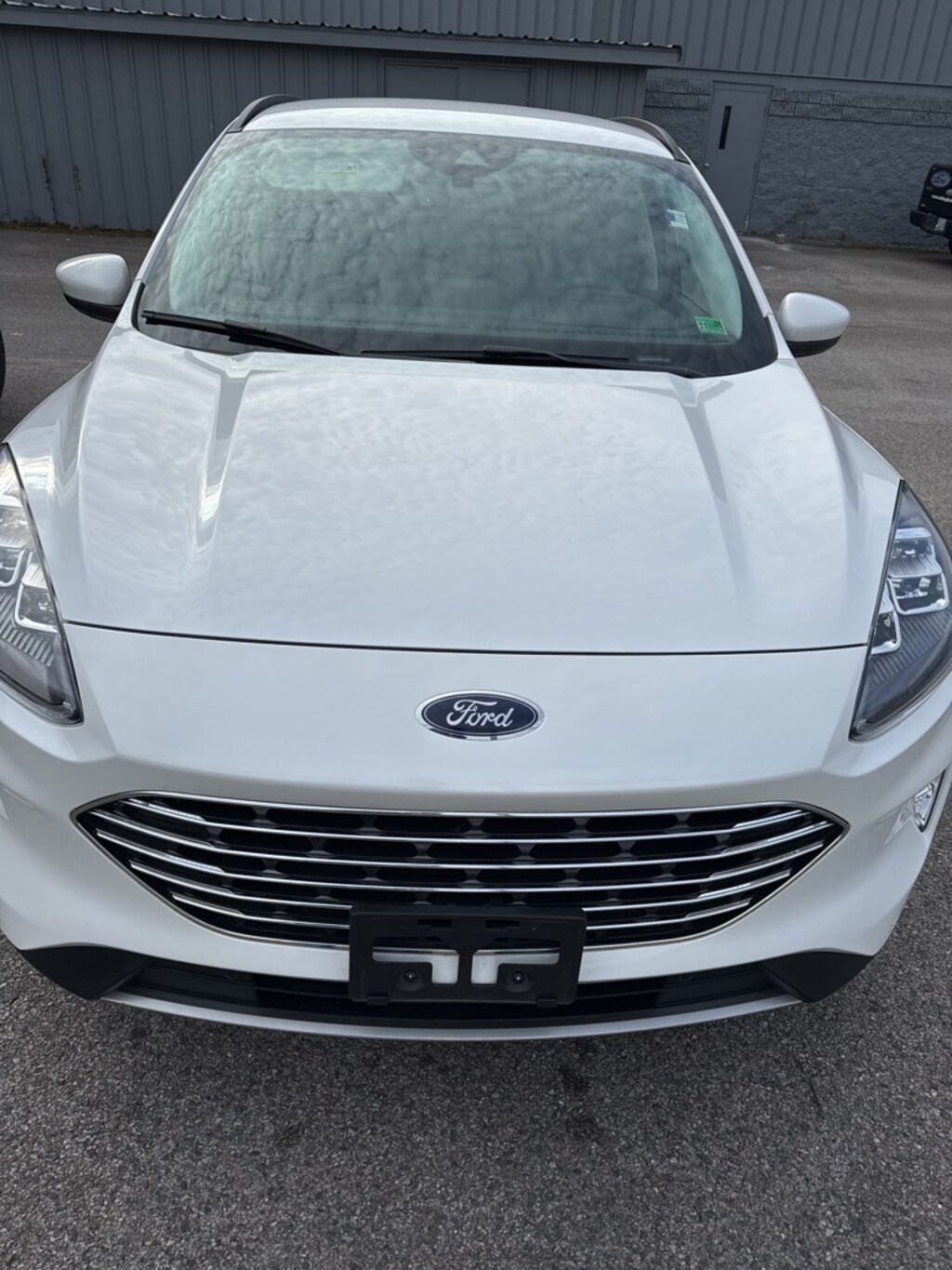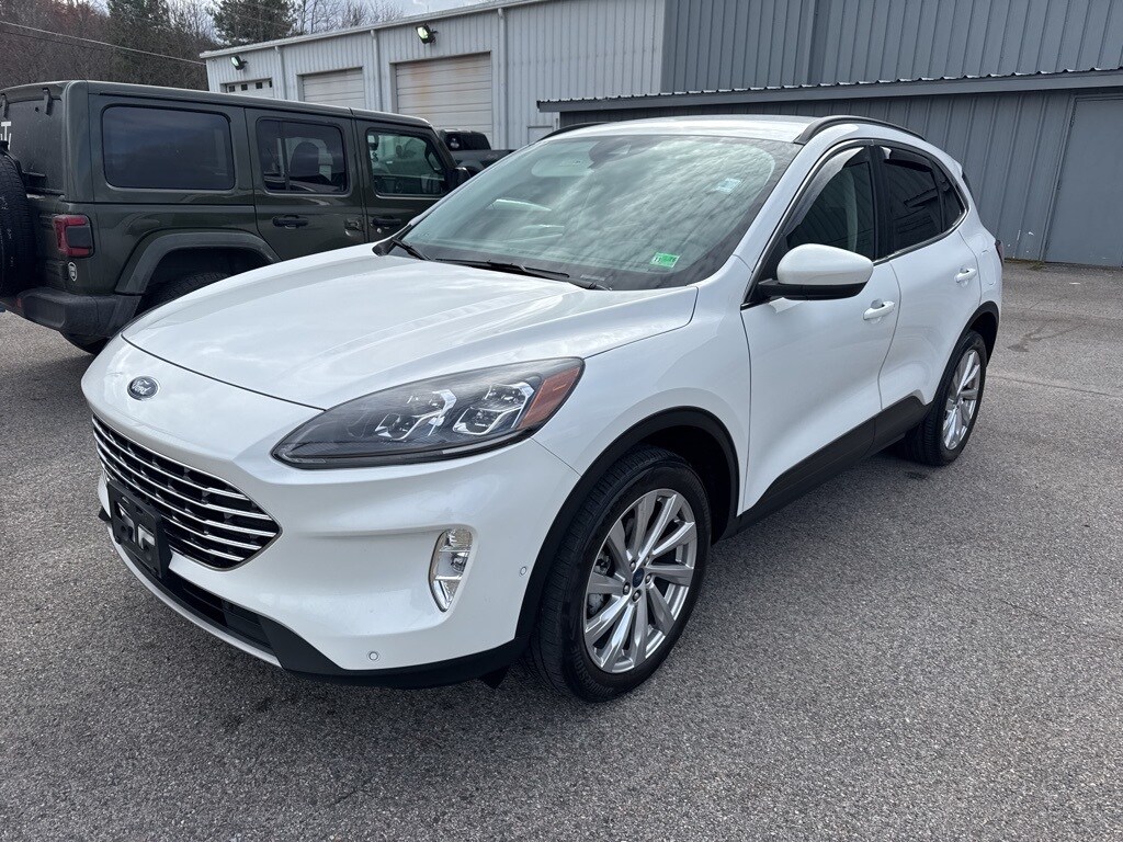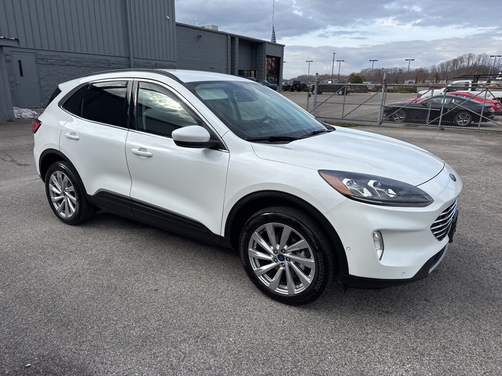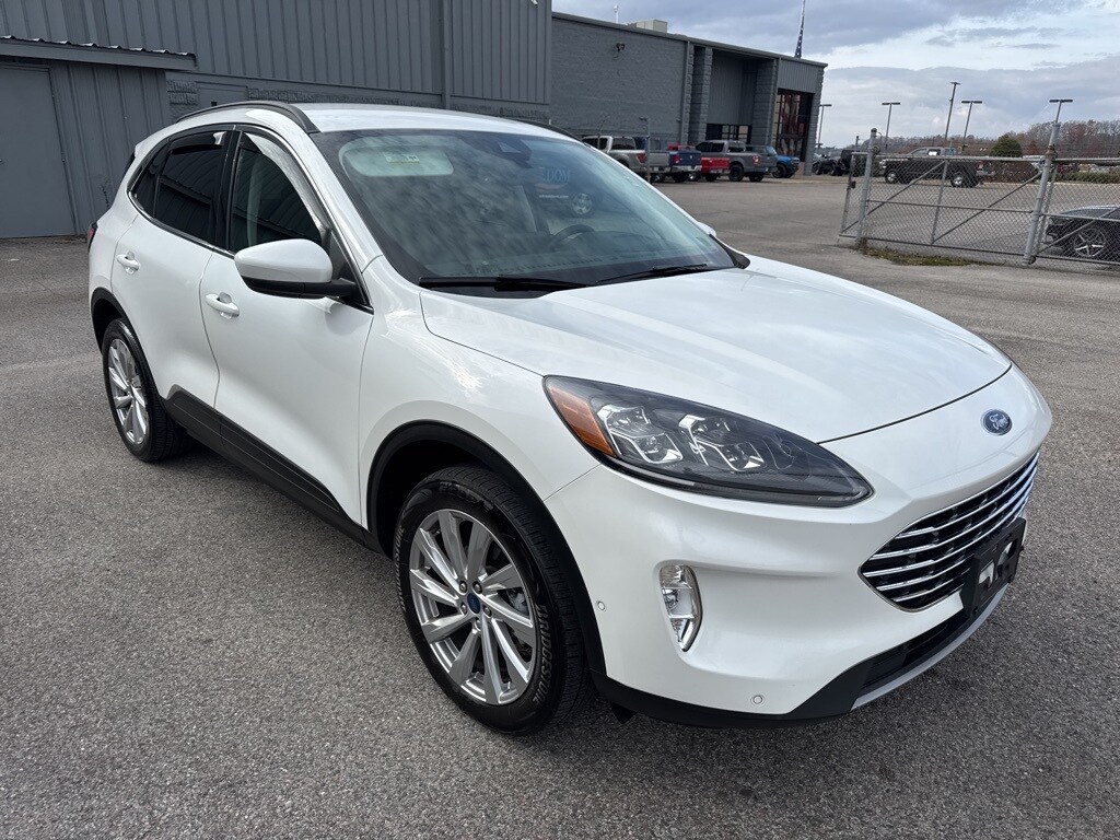This 2022 White Metallic Ford Escape Titanium AWD is well equipped and includes these features and benefits: Class II Trailer Tow Package, Equipment Group 401A, Titanium Elite Package (Active Park Assist 2.0, Chrome 5-Bar Upper Grille w/Chrome Surround, Front & Rear Floor Mats, Front & Rear Silver Skid Plates, HD Radio, Head-Up Display, Heated Leather-Trimmed Front Sport Contour Seats, Leather Wrapped Steering Wheel, Radio: B&O Sound System by Bang & Olufsen, Wheels: 19" Luster Nickel-Painted Aluminum, and Wireless Charging Pad), AWD, 3.47 Axle Ratio, 4-Wheel Disc Brakes, 6 Speakers, ABS brakes, Air Conditioning, Alloy wheels, AM/FM radio: SiriusXM, AM/FM Stereo, Auto High-beam Headlights, Auto-dimming Rear-View mirror, Automatic temperature control, Brake assist, Bumpers: body-color, Cargo Mat, Compass, Delay-off headlights, Driver door bin, Driver vanity mirror, Dual front impact airbags, Dual front side impact airbags, Electronic Stability Control, Emergency communication system: SYNC 3 911 Assist, Exterior Parking Camera Rear, FordPass Connect, Four wheel independent suspension, Front anti-roll bar, Front Bucket Seats, Front Center Armrest, Front dual zone A/C, Front fog lights, Front License Plate Bracket, Front reading lights, Fully automatic headlights, Garage door transmitter, Hands-Free Foot-Activated Liftgate Feature Removal, Heated ActiveX Trimmed Front Sport Contour Bucket Seats, Heated door mirrors, Heated front seats, Heated steering wheel, Illuminated entry, Knee airbag, Low tire pressure warning, Memory seat, Navigation System, Occupant sensing airbag, Outside temperature display, Overhead airbag, Overhead console, Panic alarm, Passenger door bin, Passenger vanity mirror, Power door mirrors, Power driver seat, Power Liftgate, Power passenger seat, Power steering, Power windows, Radio data system, Rain sensing wipers, Rear anti-roll bar, Rear reading lights, Rear seat center armrest, Rear window defroster, Rear window wiper, Remote keyless entry, Roof rack: rails only, Security system, Speed control, Speed-sensing steering, Speed-Sensitive Wipers, Split folding rear seat, Spoiler, Steering wheel mounted audio controls, SYNC 3 Communications & Entertainment System, Tachometer, Telescoping steering wheel, Tilt steering wheel, Traction control, Trip computer, Variably intermittent wipers, Voice-Activated Touchscreen Navigation System, and Wheels: 19" Machined-Face Aluminum.