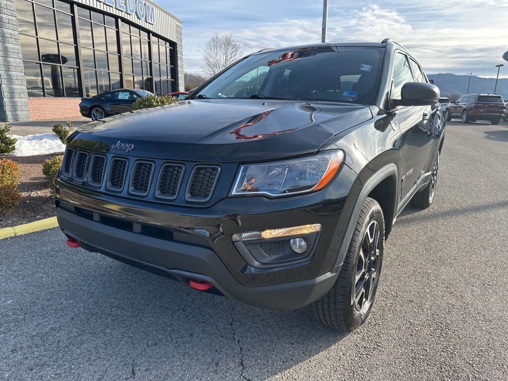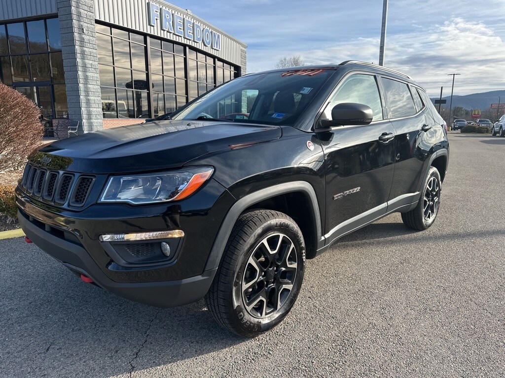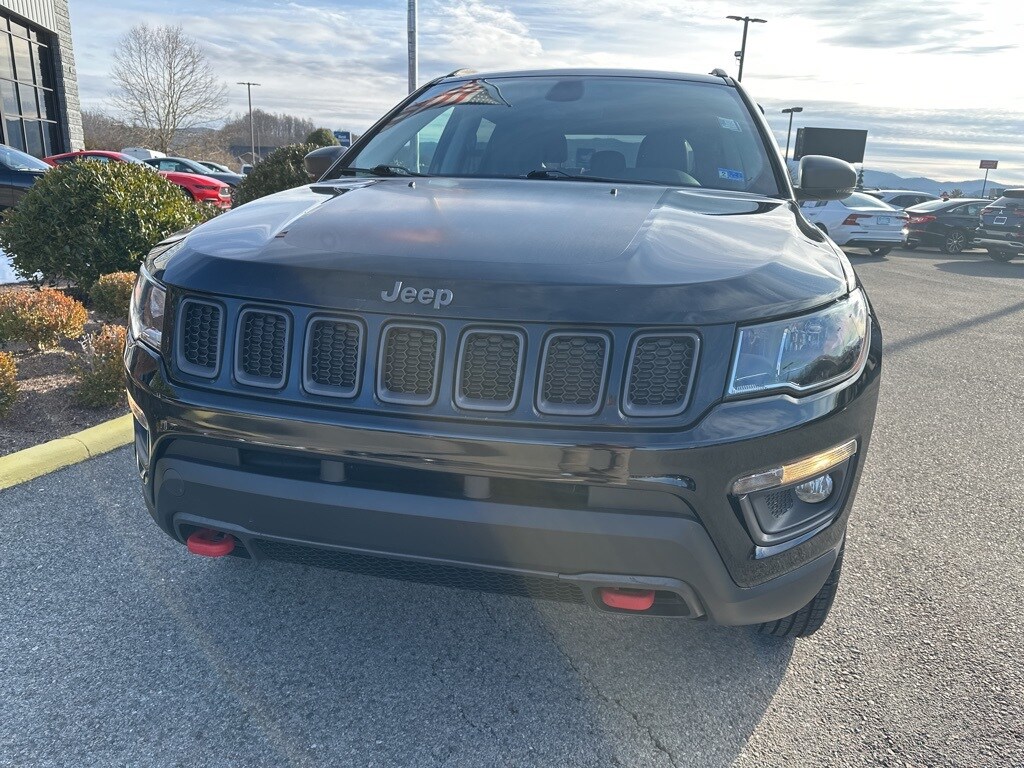 This 2020 Diamond Black Crystal Pearlcoat Jeep Compass Trailhawk 4WD is well equipped and includes these features and benefits: Quick Order Package 2GE, 4WD, 17" x 6.5" Aluminum Wheels, 4-Wheel Disc Brakes, 4.334 Axle Ratio, 6 Speakers, 8.4" Touch Screen Display, ABS brakes, Air Conditioning, Air Vents Center Console/Rear Seats, Alloy wheels, AM/FM radio: SiriusXM, Anti-whiplash front head restraints, Apple CarPlay, Apple CarPlay/Android Auto, Automatic temperature control, Autostick Automatic Transmission, Bluetooth® Streaming Audio, Brake assist, Bumpers: body-color, Compass, Delay-off headlights, Driver door bin, Driver vanity mirror, Dual front impact airbags, Dual front side impact airbags, Electronic Stability Control, Four wheel independent suspension, Front anti-roll bar, Front Bucket Seats, Front Center Armrest w/Storage, Front dual zone A/C, Front fog lights, Front License Plate Bracket, Front reading lights, Fully automatic headlights, Google Android Auto, GPS Antenna Input, Heated door mirrors, Illuminated entry, Knee airbag, Leather Shift Knob, Leather Wrapped Shift Knob, Low tire pressure warning, Manufacturer's Statement of Origin (DISC), Media Hub (USB, AUX), Occupant sensing airbag, Outside temperature display, Overhead airbag, Overhead console, Panic alarm, ParkView Rear Back-Up Camera, Passenger door bin, Passenger vanity mirror, Power door mirrors, Power steering, Power windows, Premium Cloth/Leather Trim Bucket Seats, Radio: Uconnect 4 w/8.4" Display, Rear anti-roll bar, Rear seat center armrest, Rear window defroster, Rear window wiper, Remote keyless entry, Roof rack: rails only, Speed control, Split folding rear seat, Spoiler, Steering wheel mounted audio controls, Tachometer, Telescoping steering wheel, Tilt steering wheel, Traction control, Trip computer, Turn signal indicator mirrors, USB Host Flip, and Variably intermittent wipers.