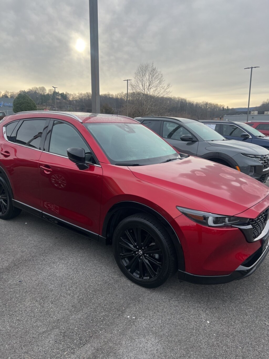 This 2022 Soul Red Crystal Metallic Mazda CX-5 2.5 Turbo AWD is well equipped and includes these features and benefits: 10 Speakers, 4-Wheel Disc Brakes, 4.411 Axle Ratio, ABS brakes, Air Conditioning, All-Weather Floor Mats, Alloy wheels, AM/FM radio: SiriusXM, AppLink/Apple CarPlay and Android Auto, Auto High-beam Headlights, Auto-dimming Rear-View mirror, Automatic temperature control, Black Lug Nuts & Black Wheel Locks, Brake assist, Bumpers: body-color, Delay-off headlights, Driver door bin, Driver vanity mirror, Dual front impact airbags, Dual front side impact airbags, E911 Automatic Emergency Notification, Electronic Stability Control, Emergency communication system: MAZDA CONNECT, Exterior Parking Camera Rear, Four wheel independent suspension, Front anti-roll bar, Front Bucket Seats, Front Center Armrest w/Storage, Front dual zone A/C, Front reading lights, Fully automatic headlights, Garage door transmitter: HomeLink, Heads-Up Display, Heated door mirrors, Heated front seats, Heated rear seats, Heated steering wheel, Heated/Ventilated Front Bucket Seats, Illuminated entry, Infotainment System Voice Command, Leather Seat Trim, Leather Shift Knob, Low tire pressure warning, Memory seat, Multifunction Commander Control, Occupant sensing airbag, Outside temperature display, Overhead airbag, Overhead console, Pandora, Panic alarm, Passenger door bin, Passenger vanity mirror, Power door mirrors, Power driver seat, Power Liftgate, Power moonroof, Power passenger seat, Power steering, Power windows, Premium audio system: Bose, Radio Broadcast Data System Program Information, Radio data system, Radio: AM/FM/HD Audio System, Rain sensing wipers, Rear anti-roll bar, Rear reading lights, Rear seat center armrest, Rear window defroster, Rear window wiper, Remote keyless entry, Roadside Assistance Kit, Roof Rack Side Rails, SMS Text Msg Audio Delivery & Reply, Soul Red Crystal Metallic Paint, Speed control, Speed-sensing steering, Split folding rear seat, Spoiler, Steering wheel mounted audio controls, Tachometer, Telescoping steering wheel, Tilt steering wheel, Traction control, Trip computer, Turn signal indicator mirrors, Variably intermittent wipers, Ventilated front seats, and Wheels: 19" x 7J Aluminum Alloy.